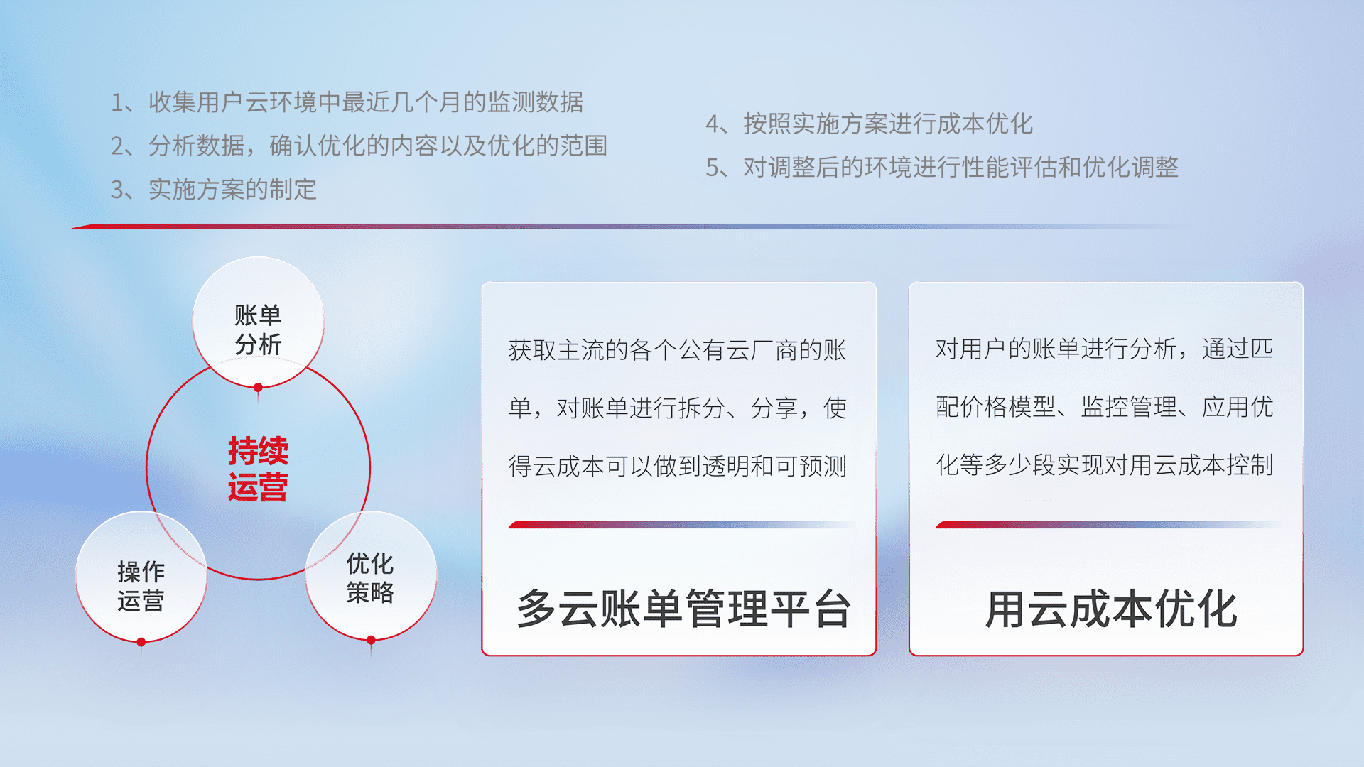 通过多云纳管,,,以统一的资源数据模型把客户的云资源进行抽象和封装,,,进而实现对多云资源的统一操作,,,,保障云资源管理的可靠性、、、、稳定性与可用性。。量身定制化运维内容,,配置、、、、开发运维、、、补丁管理、、备份、、、、监控、、认证和访问管理、、、审计和日常巡检等,,保障在用云过程中的可靠度,,,稳定度以及高可用率。。。。